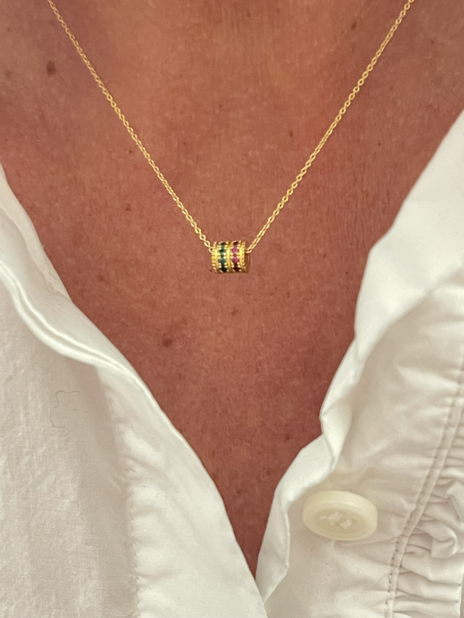 Lumineux collier dont le pendentif cylindrique, serti de pierres multicolores, est traversée par une chaine fine dorée à l’or fin.