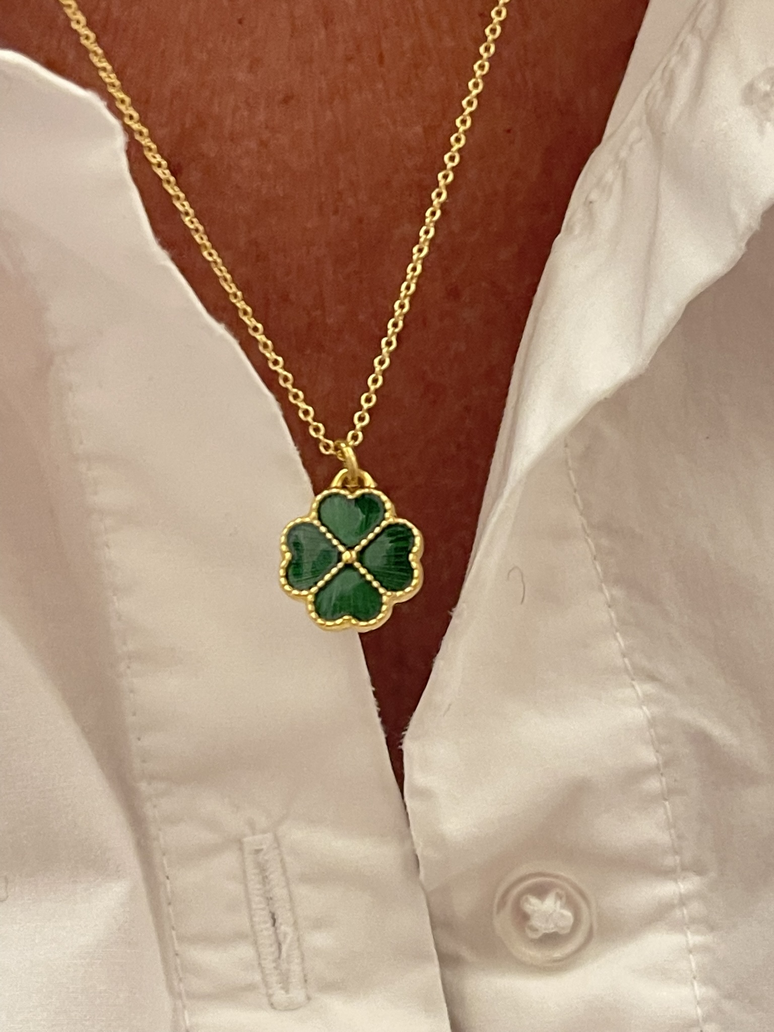 Un joli collier trèfle à 4 feuilles où l’on peut y voir aussi 4 cœurs collé-serrés.